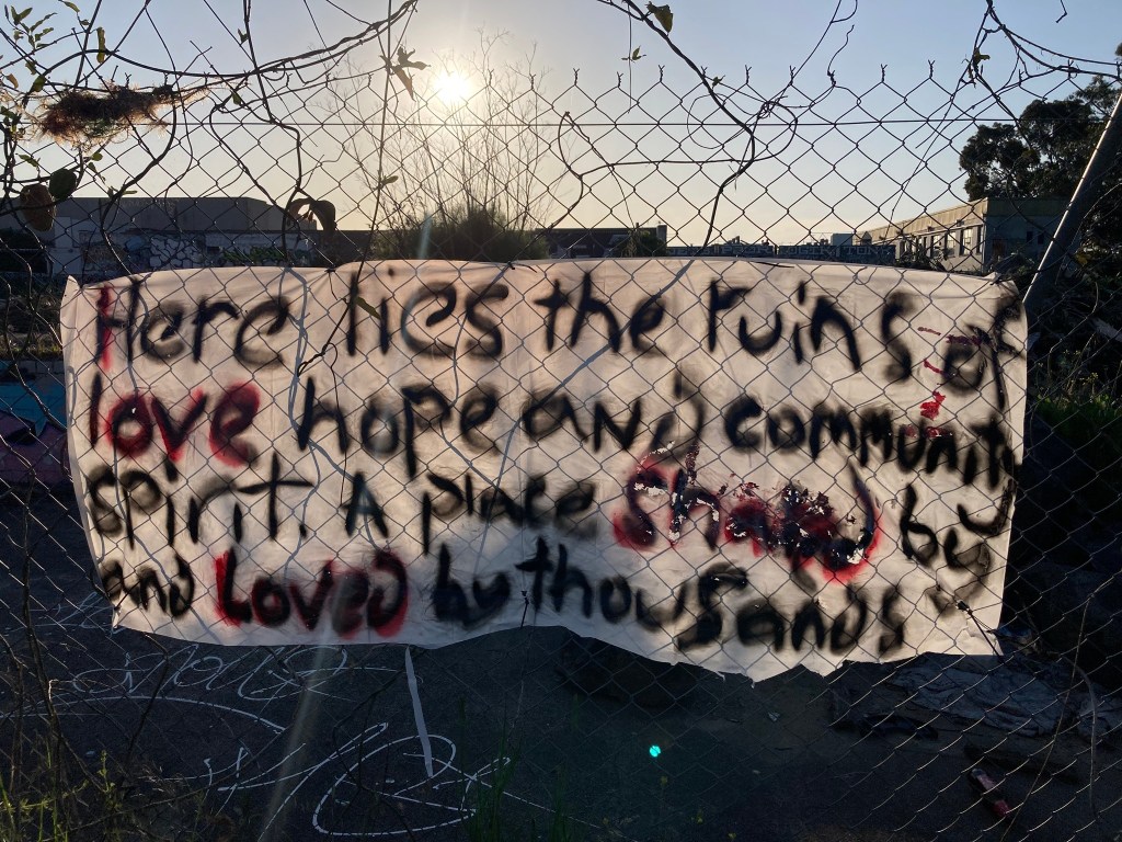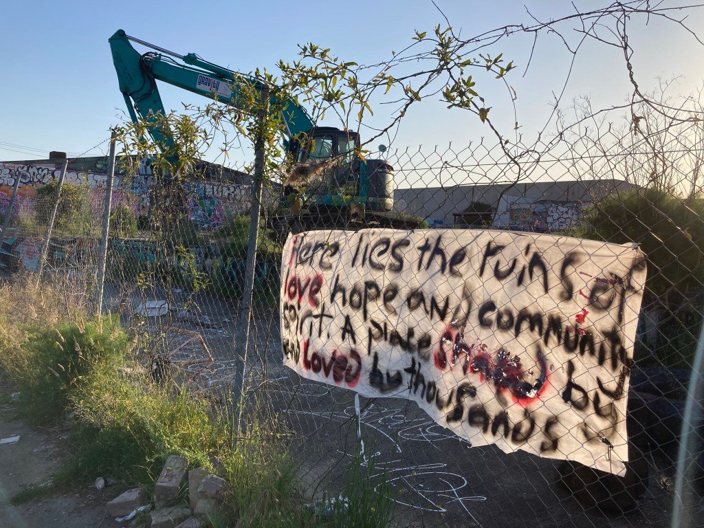 DIY skate park on vacant block, Preston. Developers arrive after 10 years or so of improvisation and play.DIY skate park on vacant block, Preston. Developers arrive after 10 years or so of improvisation and play.